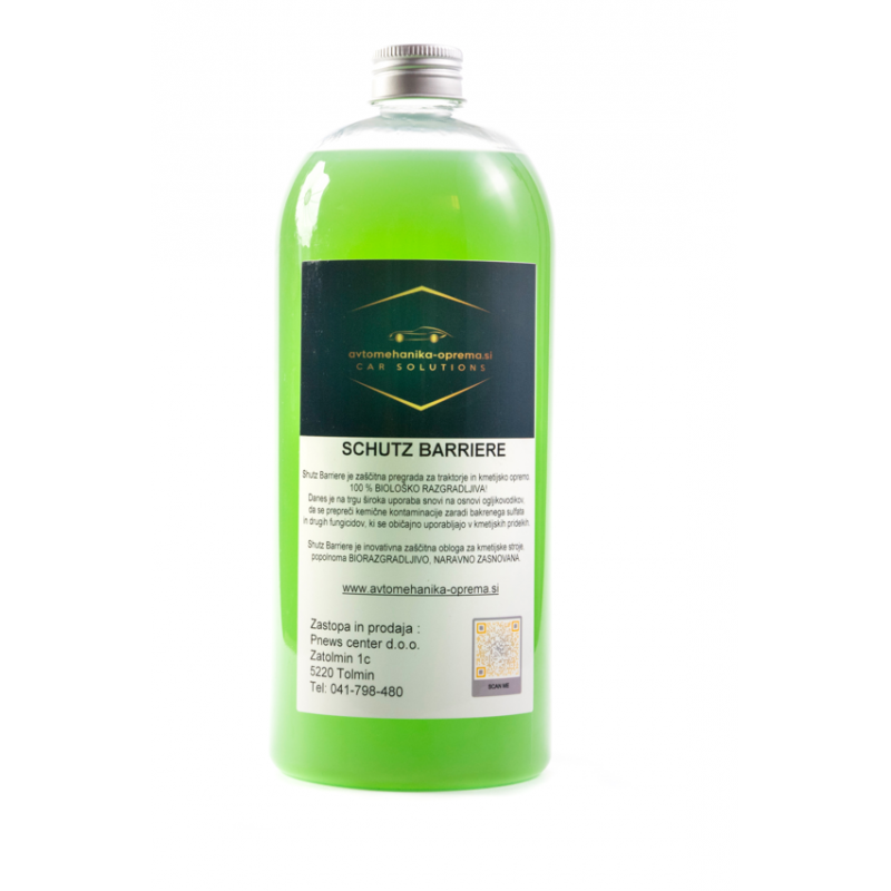 Shutz Barriere je inovativna zaščitna obloga za kmetijske stroje, popolnoma BIORAZGRADLJIVO, NARAVNO ZASNOVANA. Zaščita, ki jo ustvari poppolnoma izolira vse površine traktorja in opreme, ki so izpostavljene stiku in se lahko nanese tudi na steklo. Za razliko od zaščitnih voskov na trgu je SHUTZ BARRIERE enostaven za uporabo, suši in ustvarja film za dolgotrajno zaščito. Nanos se lahko izvaja kjerkoli s pomočjo nizkotlačne pršilke in traja do odstranitve, kar se bo izvedlo z uporabo hladno vodnega tlaka. Po odstranitvi filma bo vozilo svetlejše saj Shutz Barriere vsebuje polimer za poliranje, ki temelji na nano tehnologiji.